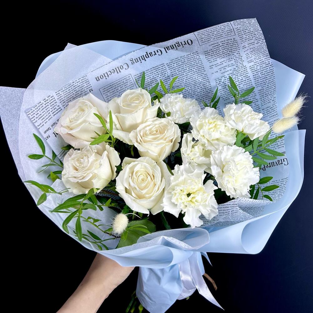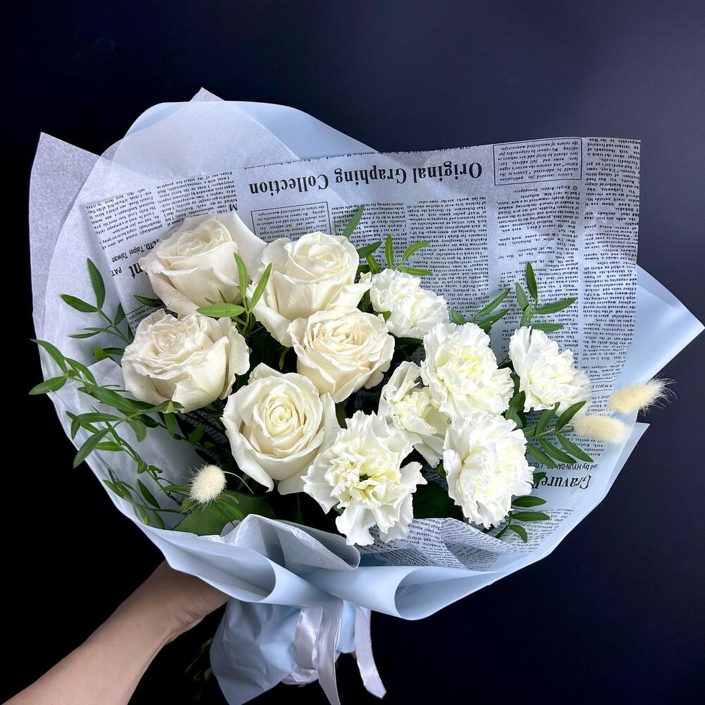 Гвоздика одноголовая – 6 шт.роза премиальная пионовидная «плая бланка» – 5 шт.Лагурус (сухоцвет) – 3 шт.Фисташка – 3 шт.Упаковка дизайнерская – 1 шт.