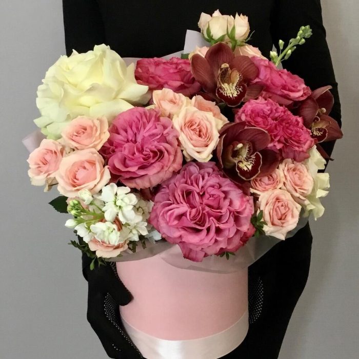 Маттиола – 2 шт.Кустовая роза – 4 шт.Зелень – 3 шт.Лента атласная – 1 шт.ЦИМБИДИУМ – 3 шт.Французская роза – 2 шт.Пленка матовая – 1 шт.Оазис флористический – 2 шт.пионовидная роза кантри блю – 5 шт.шляпная коробка 18 см – 1 шт.