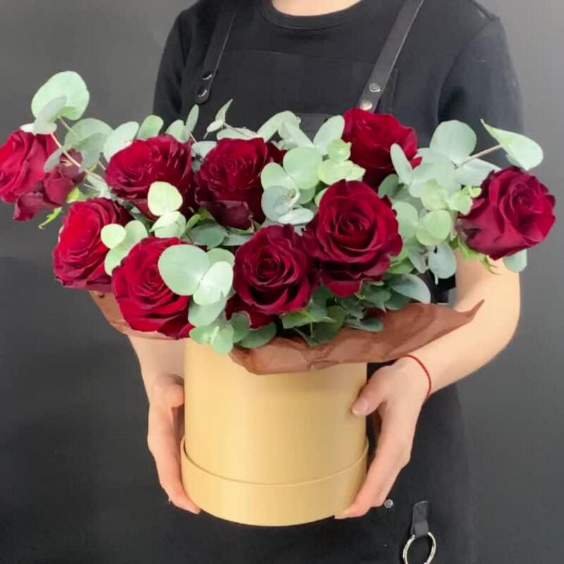 Эвкалипт – 2 шт.Роза – 9 шт.Инструкция по уходу – 1 шт.шляпная коробка с оазисом – 1 шт.подкормка для стойкости цветов – 1 шт.