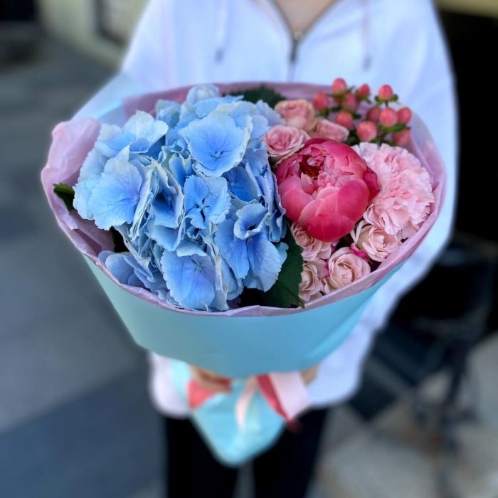 Гортензия – 1 шт.Озотамнус – 1 шт.Роза кустовая – 1 шт.Гвоздика – 3 шт.Пион коралл шарм – 1 шт.подкормка для срезанных цветов – 1 шт.инструкция по уходу за цветами – 1 шт.октрыточка с вашими пожеланиями – 1 шт.шоколадка – комплимент для получательницы – 1 шт.