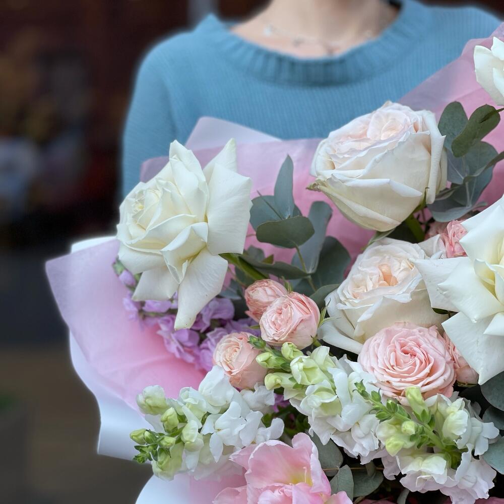 Роза Эквадор – 5 шт.Роза кустовая пионовидная – 5 шт.антиринум белый – 3 шт.Маттиола – 3 шт.Тюльпан – 4 шт.Эвкалипт Микс – 2 шт.упаковка авторская – 1 шт.
