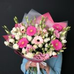 Роза – 9 шт.Лизиантус – 3 шт.Гербера мини – 7 шт.Упаковка дизайнерская – 3 шт.