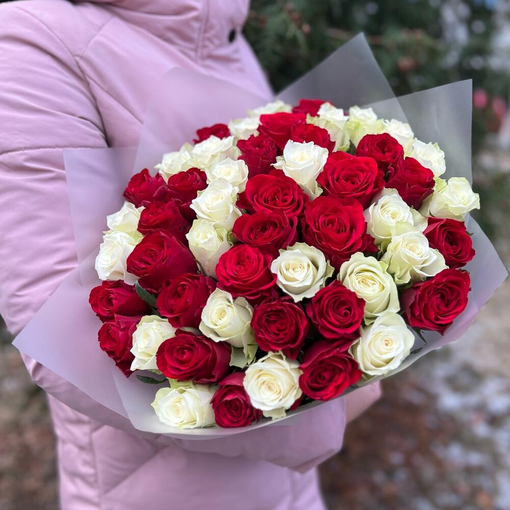 Роза красная – 26 шт.Роза белая – 25 шт.Пленка матовая – 1 шт.