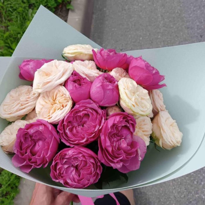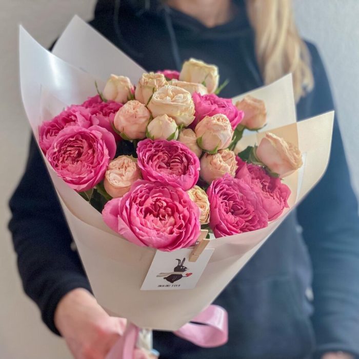 Лента – 2 шт.Крафт упаковка – 1 шт.пионовидная кустовая роза 40-50 см – 9 шт.