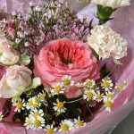 Милый букет с пионовидной розой, ромашками и лизиантусом