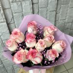 Роза Эквадор – 11 шт.Лента атласная – 1 шт.Упаковка дизайнерская – 2 шт.Гипсофила розовая – 2 шт.