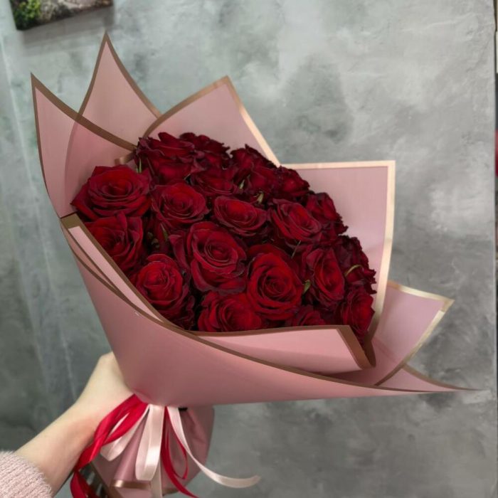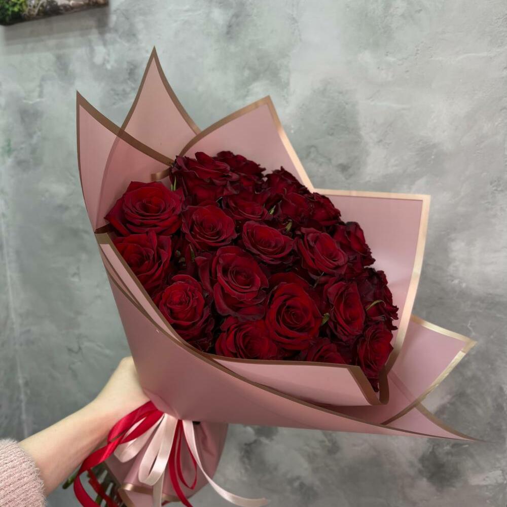 Роза эквадор 50 см – 25 шт.Упаковка дизайнерская – 3 шт.Лента атласная – 2 шт.