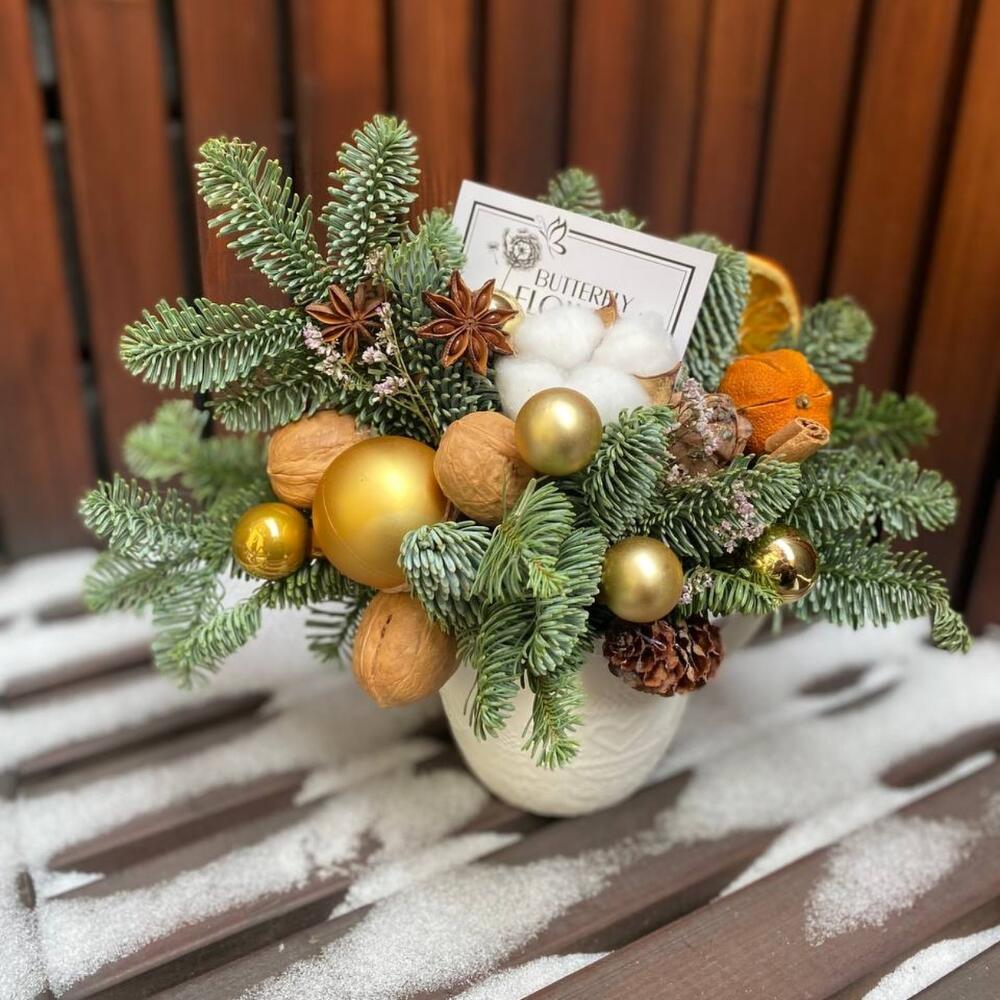 Кружка – 1 шт.мандарин сушенный – 1 шт.Бадьян – 3 шт.Елочные игрушки – 5 шт.Нобилис – 1 шт.грецкий орех в скорлупе – 3 шт.апельсин сушеный – 1 шт.Корица палочки – 3 шт.Шишки натуральные – 3 шт.Хлопок – 1 шт.