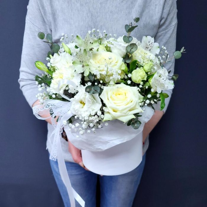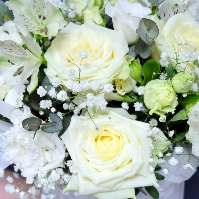 Альстромерия – 3 шт.Гипсофила – 1 шт.Лизиантус – 1 шт.Гвоздика – 3 шт.Роза белая – 3 шт.