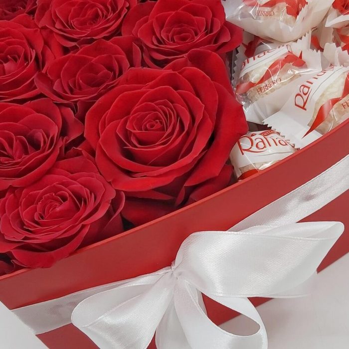 Роза Эквадор Премиум – 11 шт.Конфеты Raffaello – 150 гр.Коробка сердце – 1 шт.Лента атласная – 1 шт.Флористическая губка (оазис) – 2 шт.