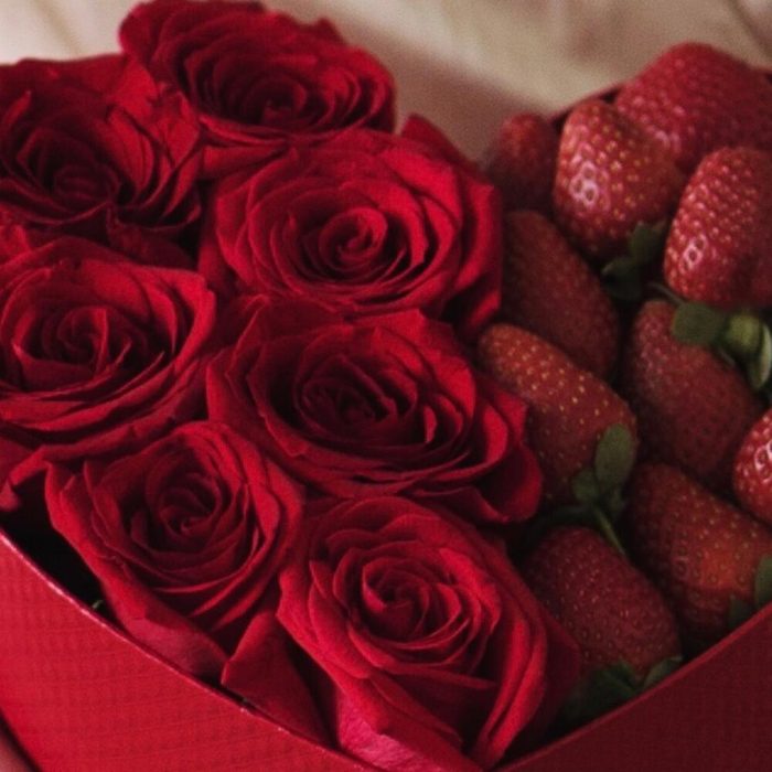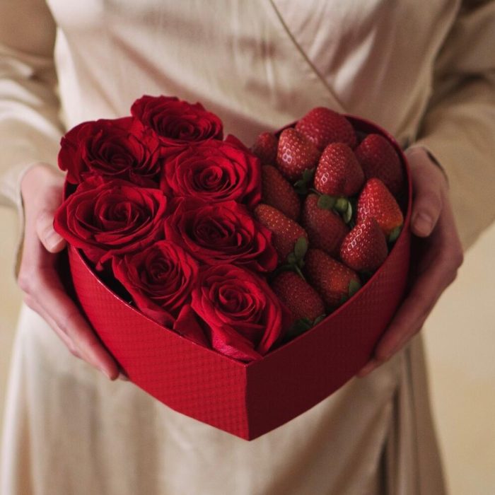 Шляпная коробка – 1 шт.Роза – 7 шт.Клубника – 300 гр.