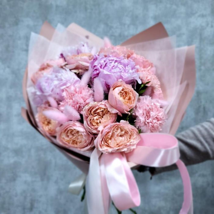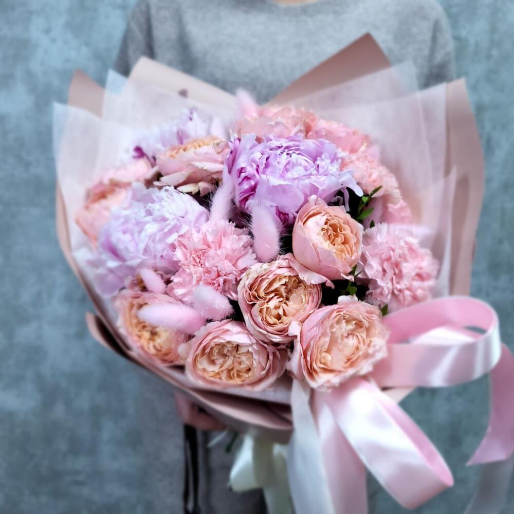 Пион – 3 шт.Гвоздика – 3 шт.Лента атласная – 3 шт.Фисташка – 2 шт.Лагурус – 11 шт.Пионовидная роза кустовая – 4 шт.