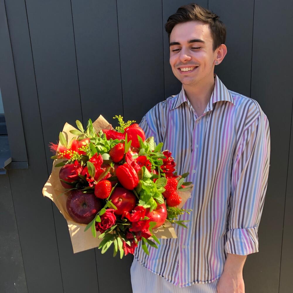 нектарины или слива – 5 шт.яблоки – 5 шт.Клубника – 5 шт.Мята пучок – 3 шт.Альстромерия – 6 шт.Лагурус – 5 шт.фисташка зелень – 2 шт.розы – 2 шт.