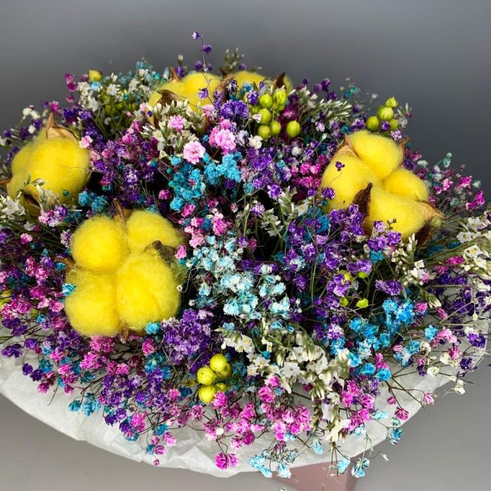 гипсофила сухоцвет – 10 шт.лимониум сухоцвет – 5 шт.Хлопок – 5 шт.абрус сухоцвет – 5 шт.Коробка – 1 шт.Оазис флористический – 1 шт.Тишью – 2 шт.Пленка прозрачная – 1 шт.Лента атласная – 2 шт.