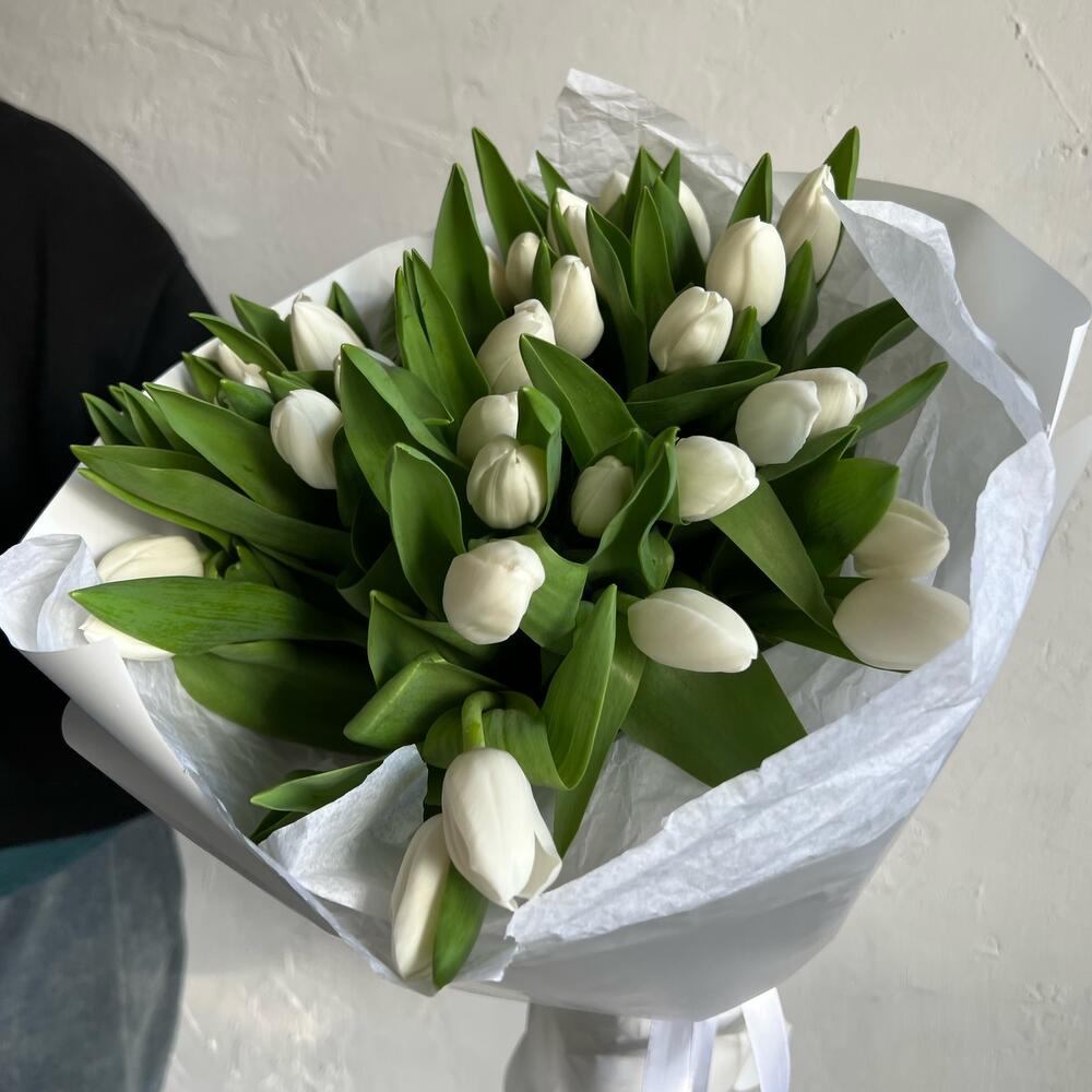 Лента атласная – 3 шт.Упаковка дизайнерская – 5 шт.Белый тюльпан – 29 шт.