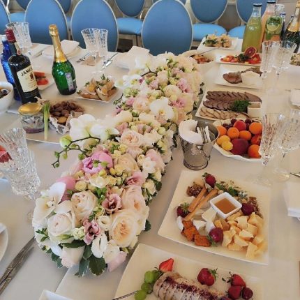 Тени в саду – Корзина с пионовидными розами, георгинами и дельфиниумом