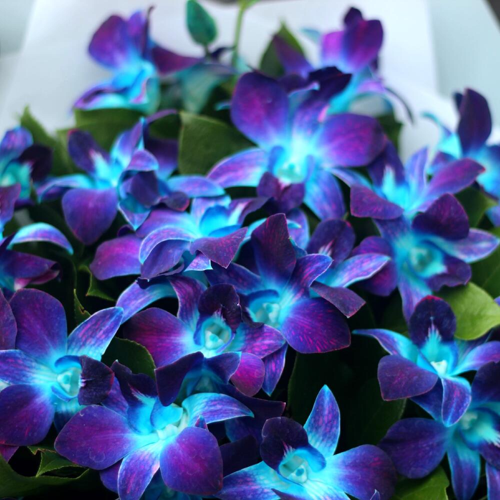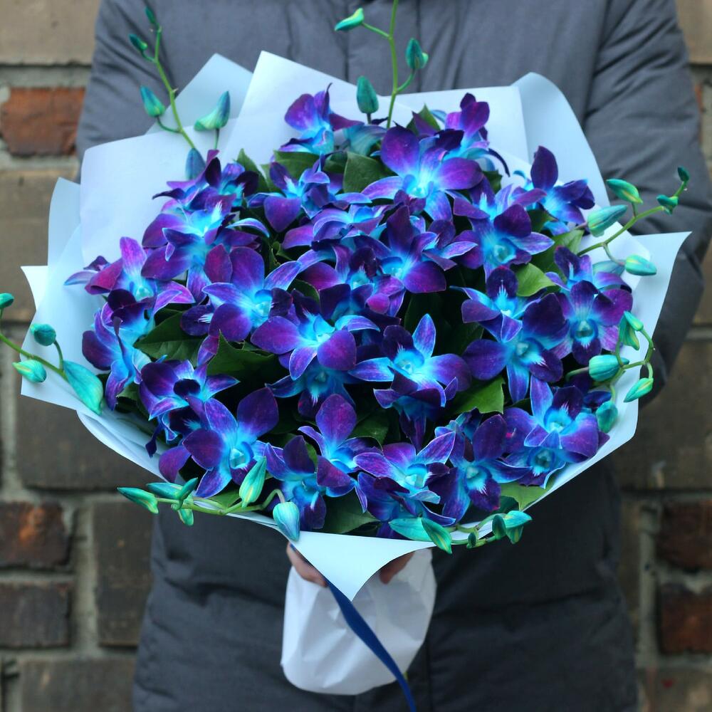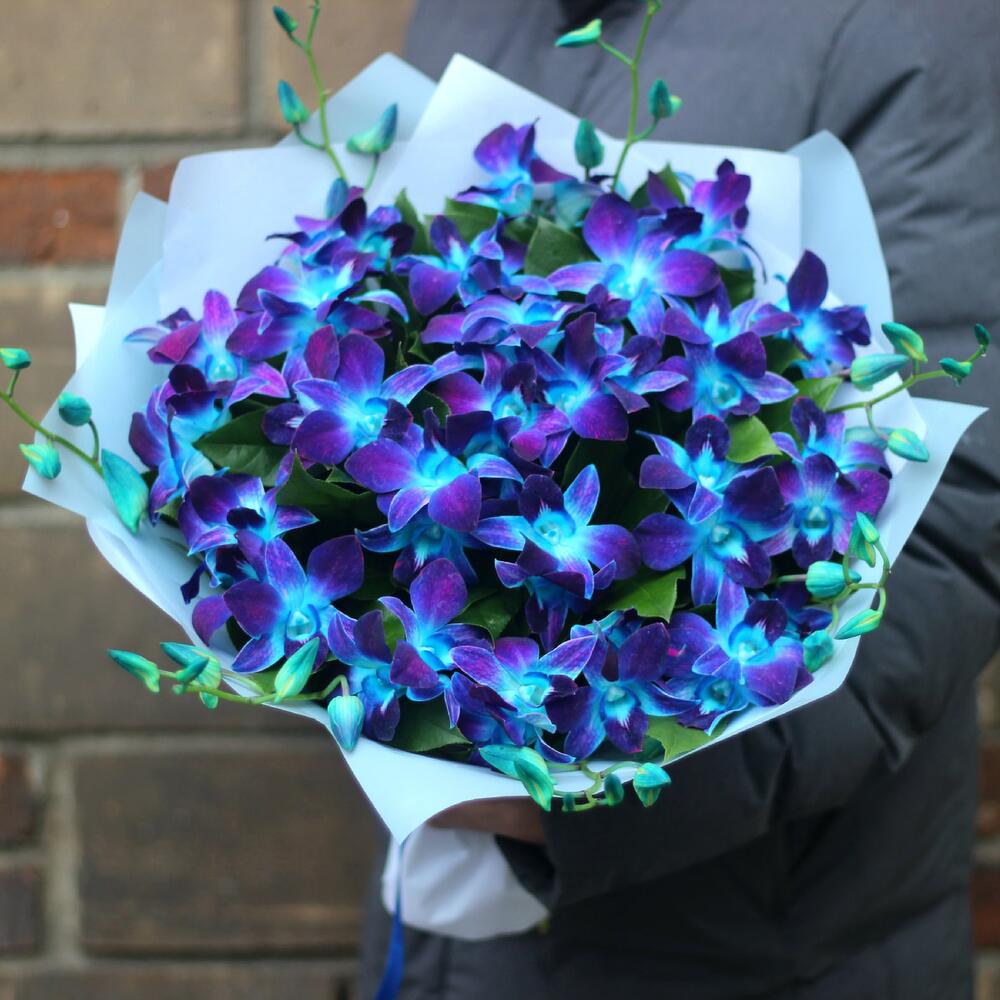 Рускус – 10 шт.Лента атласная – 1 шт.удлинитель для орхидеи – 25 шт.Средство для продления жизни цветов – 1 шт.упаковка тиффани – 3 шт.инструкция по уходу за цветами – 1 шт.любовь флориста (бесплатно) – 1 шт.орхидея дендробиум синяя цветочки – 51 шт.