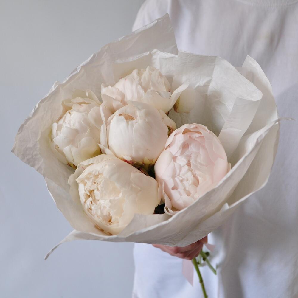 Лента атласная – 1 шт.Крафт – 2 шт.Пион белый – 5 шт.